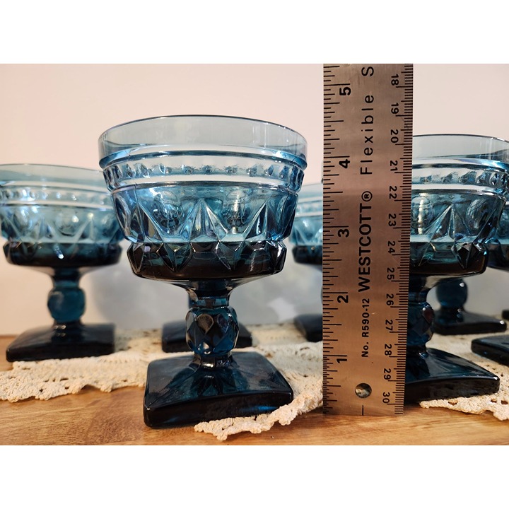 Set of 8 gorgeous vintage blue glass goblets. Champagne coupes or sherbert glasses Park Lane Blue pattern by Colony / Indiana Glass. Slightly under 4.5 inches tall, square foot, detailed stem, beautiful pressed patterned glass from the 1960s-1970s. One has a .5 mm chip to the bottom of the foot, as pictured. The others are in excellent condition with no chips.