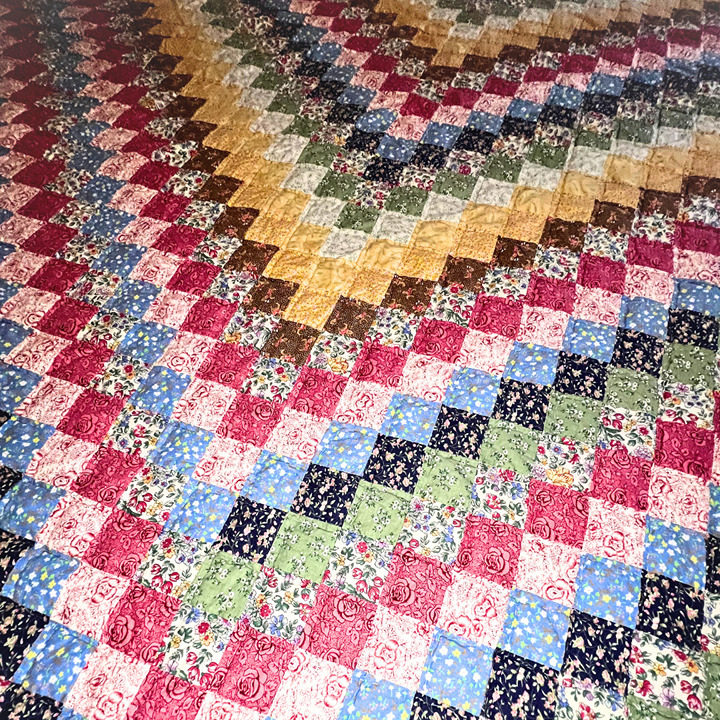 Massive, beautiful, one-of-a-kind hand-stitched floral rainbow patchwork quilt for King or California King size bed with lots of over-hang on all sides and rounded corners for the foot of the bed. Lined and double sided, the soft cotton quilt brings a comfortable and nostalgic touch to any bedroom or living room.