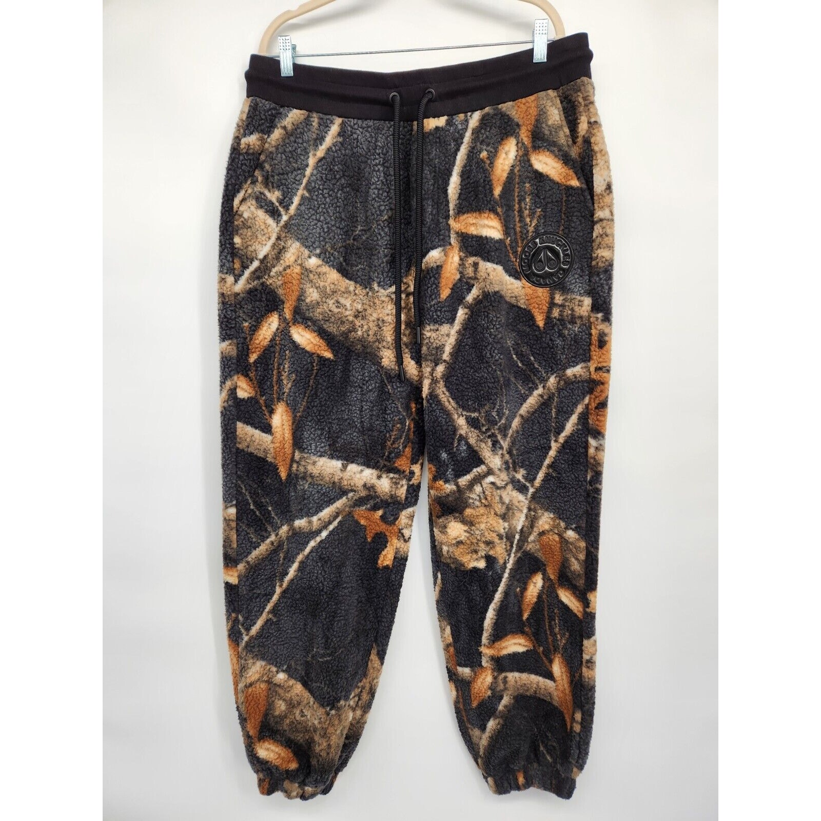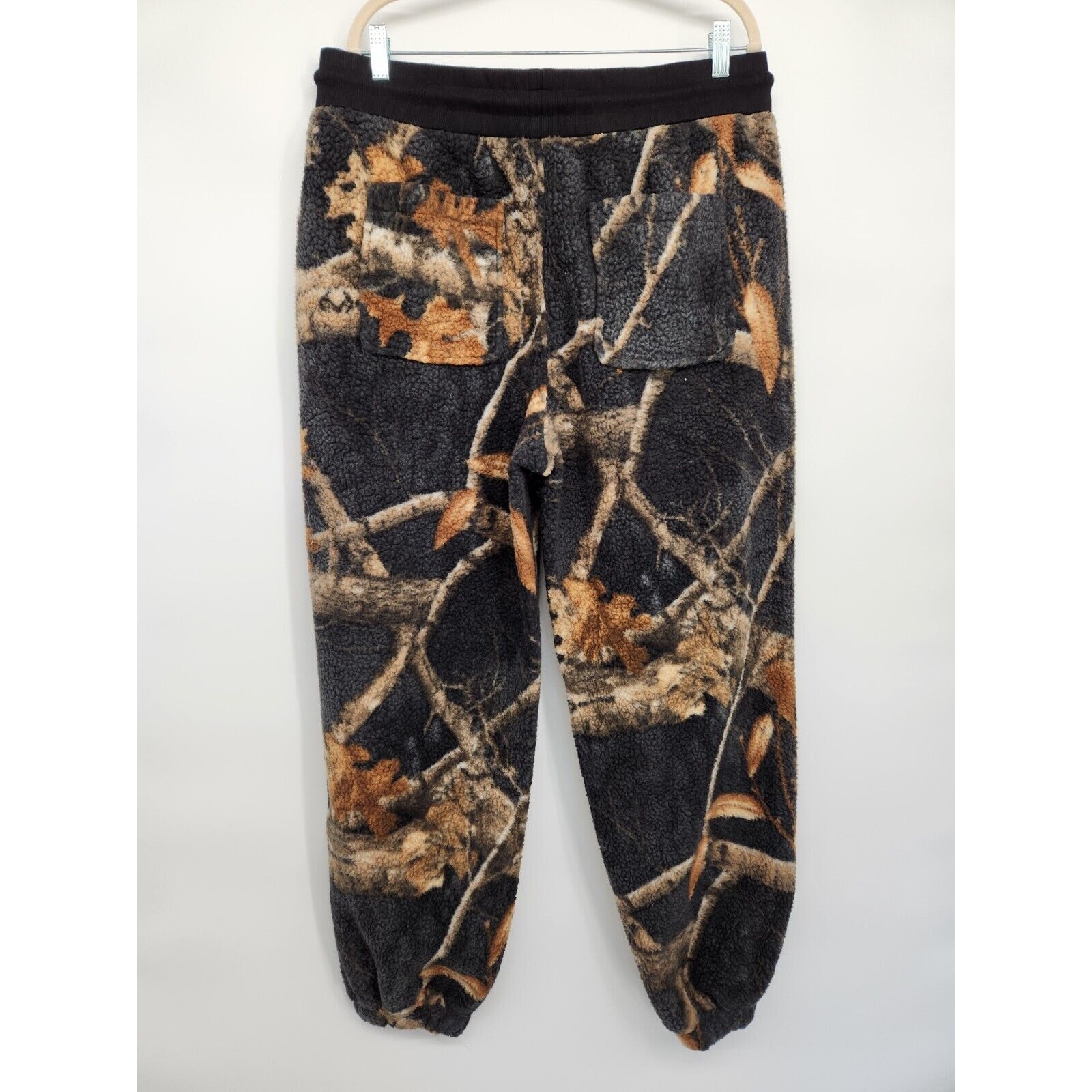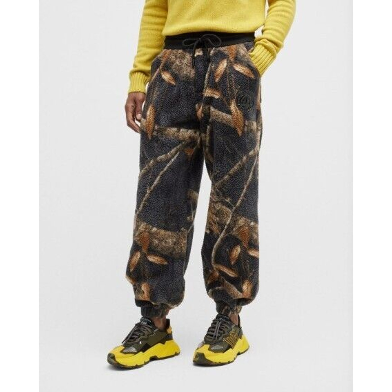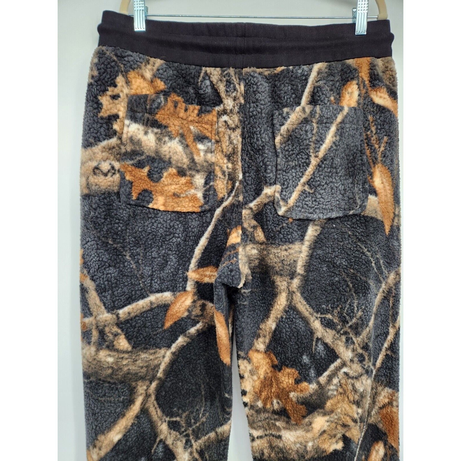 Polyester sherpa fleece lounge pants. Camouflage pattern printed throughout.