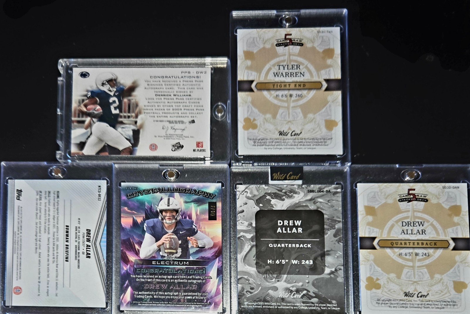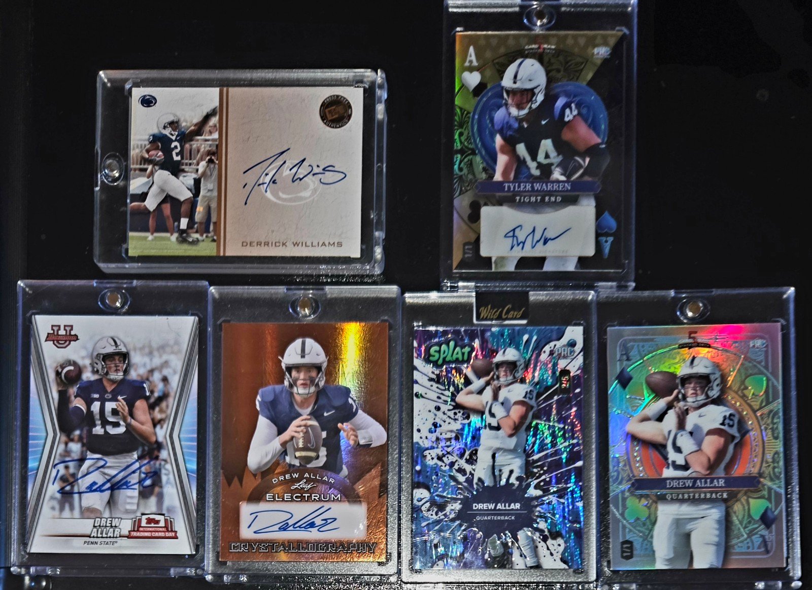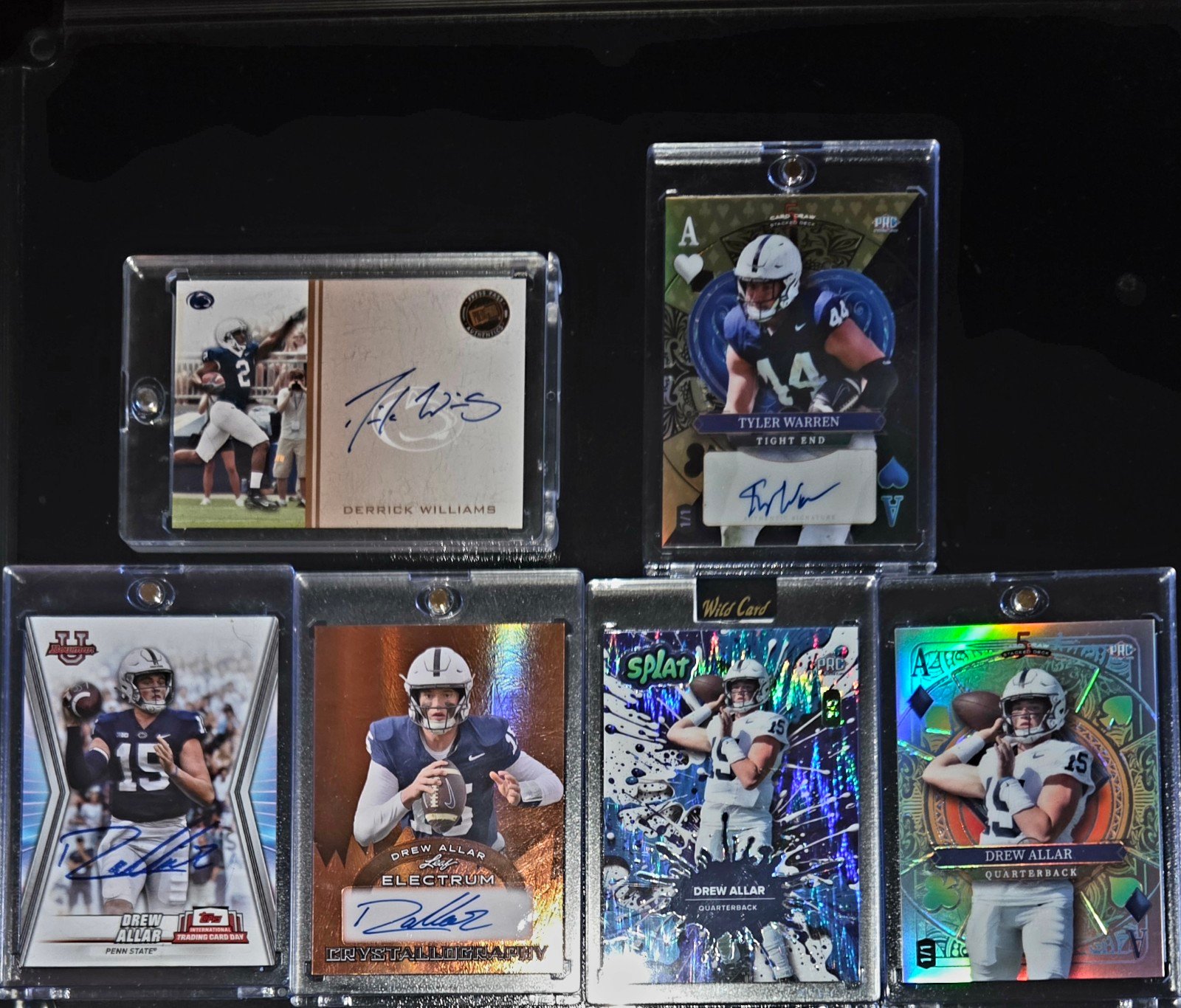 Don't miss out on this MASSIVE VARIETY LOT of Penn State university collection starting with a 2009 on card autograph Derrick Williams and the new #1 TE for the Colts Tyler Warren 2024 and 2 beautiful cards with Drew Allar autographs. Trying to sell here if not will take to card show. Ty again for all your support.