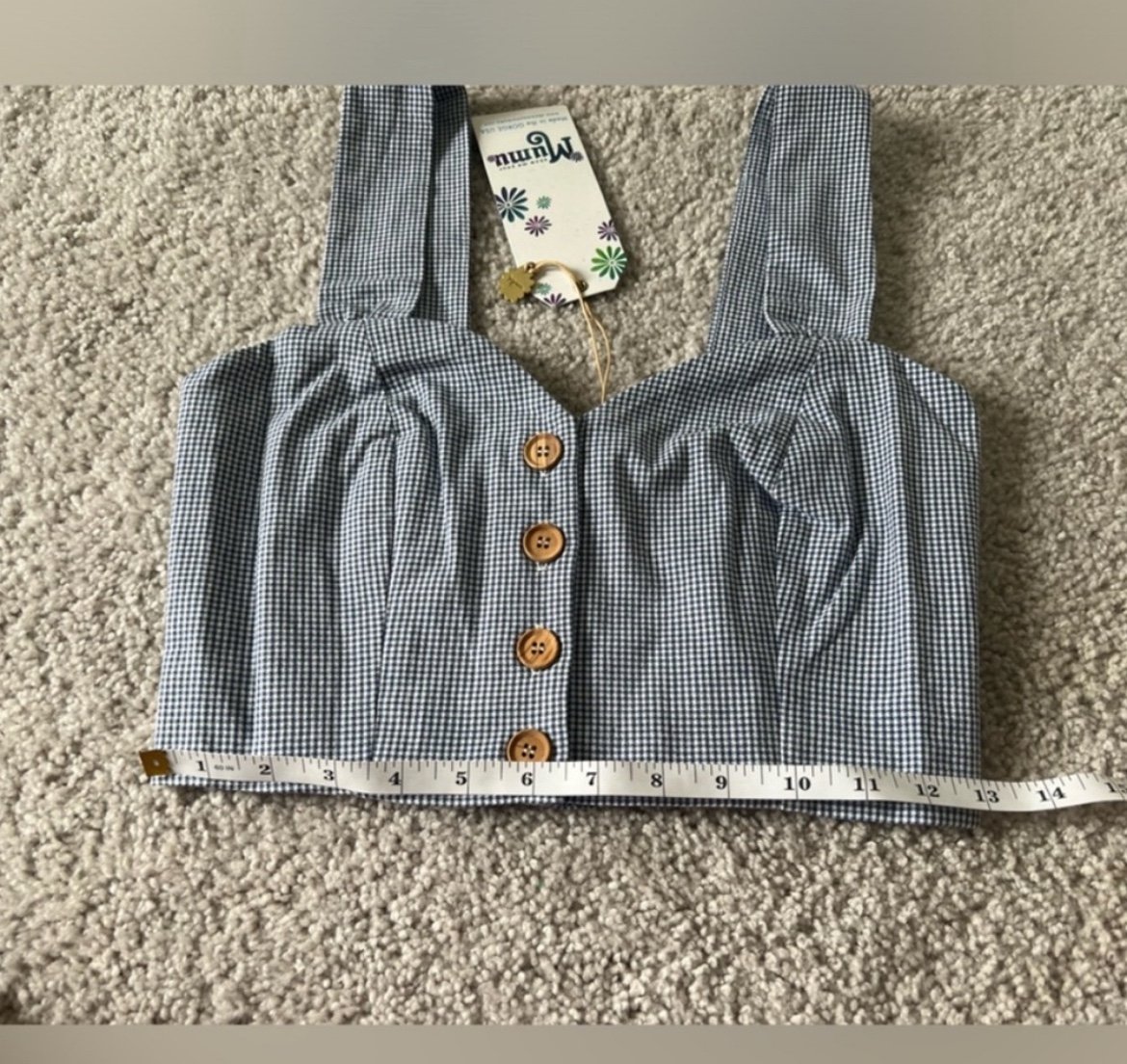 This classic blue gingham cropped top from Show Me Your Mumu features a sweetheart neckline, button-front closure, and smocked back for a flexible, comfortable fit. The cotton-spandex blend offers light stretch, making it perfect for casual summer outfits, festivals, or layering with high-waisted bottoms.