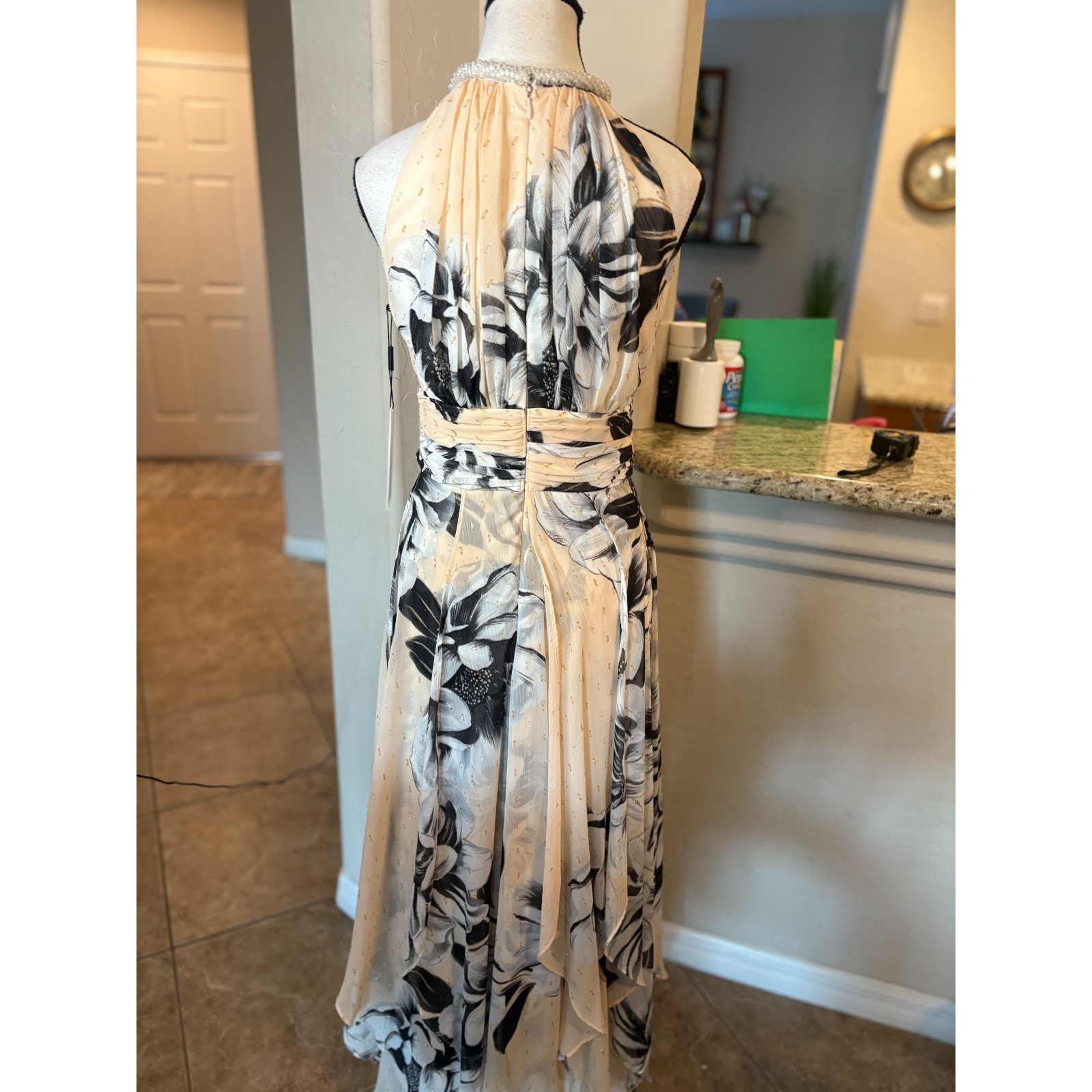 The Calvin Klein Women's Halter Neck Gown with a Draped Front and Beading is a luxurious and elegant dress perfect for party or cocktail occasions during the summer and spring seasons. The dress features a floral pattern, sleeveless design with a halter neckline, and a zip closure for easy wear. Made from chiffon fabric and polyester material, this long maxi dress is adorned with beautiful beading accents that add a touch of sophistication to the overall design. Ideal for women looking for a chic and stylish outfit from a reputable brand like Calvin Klein.