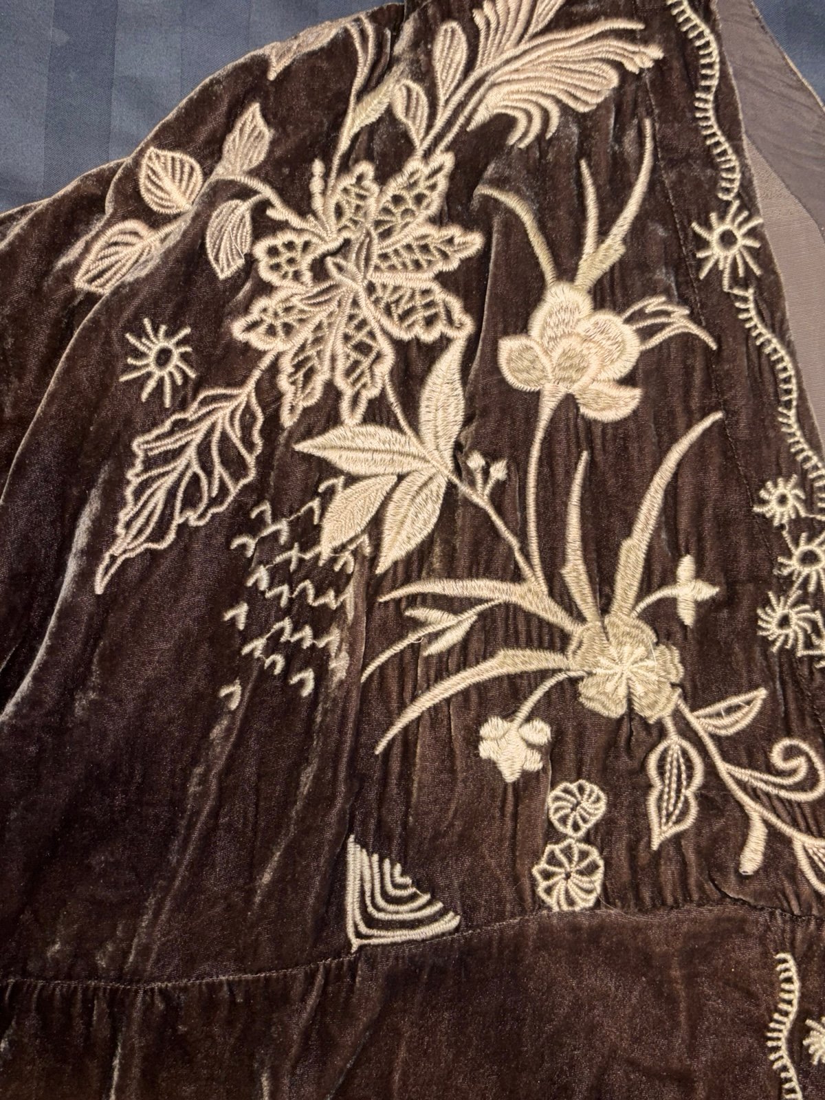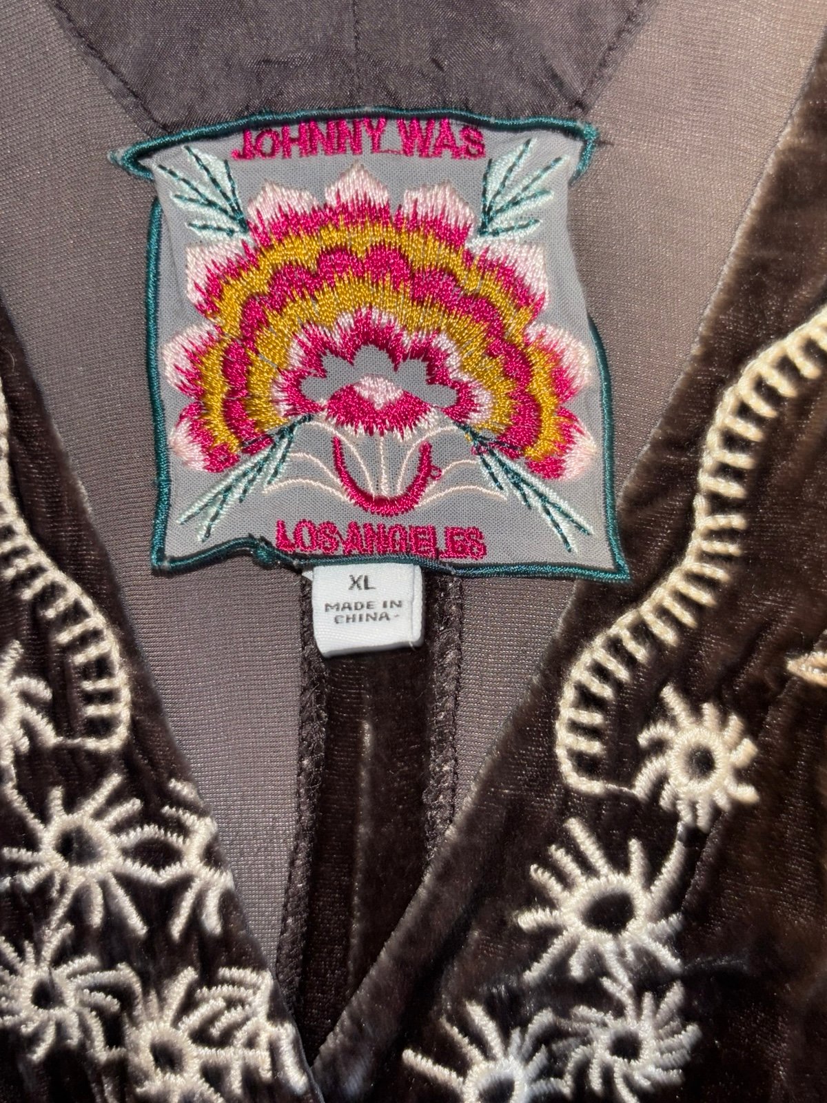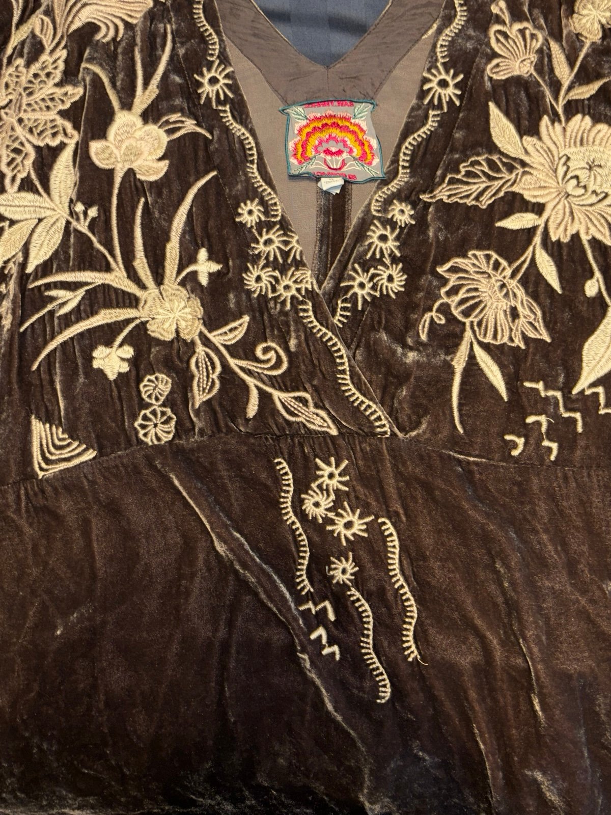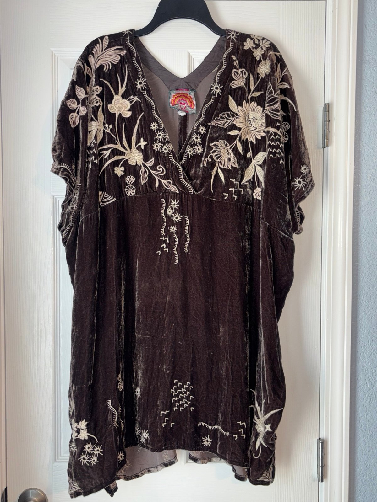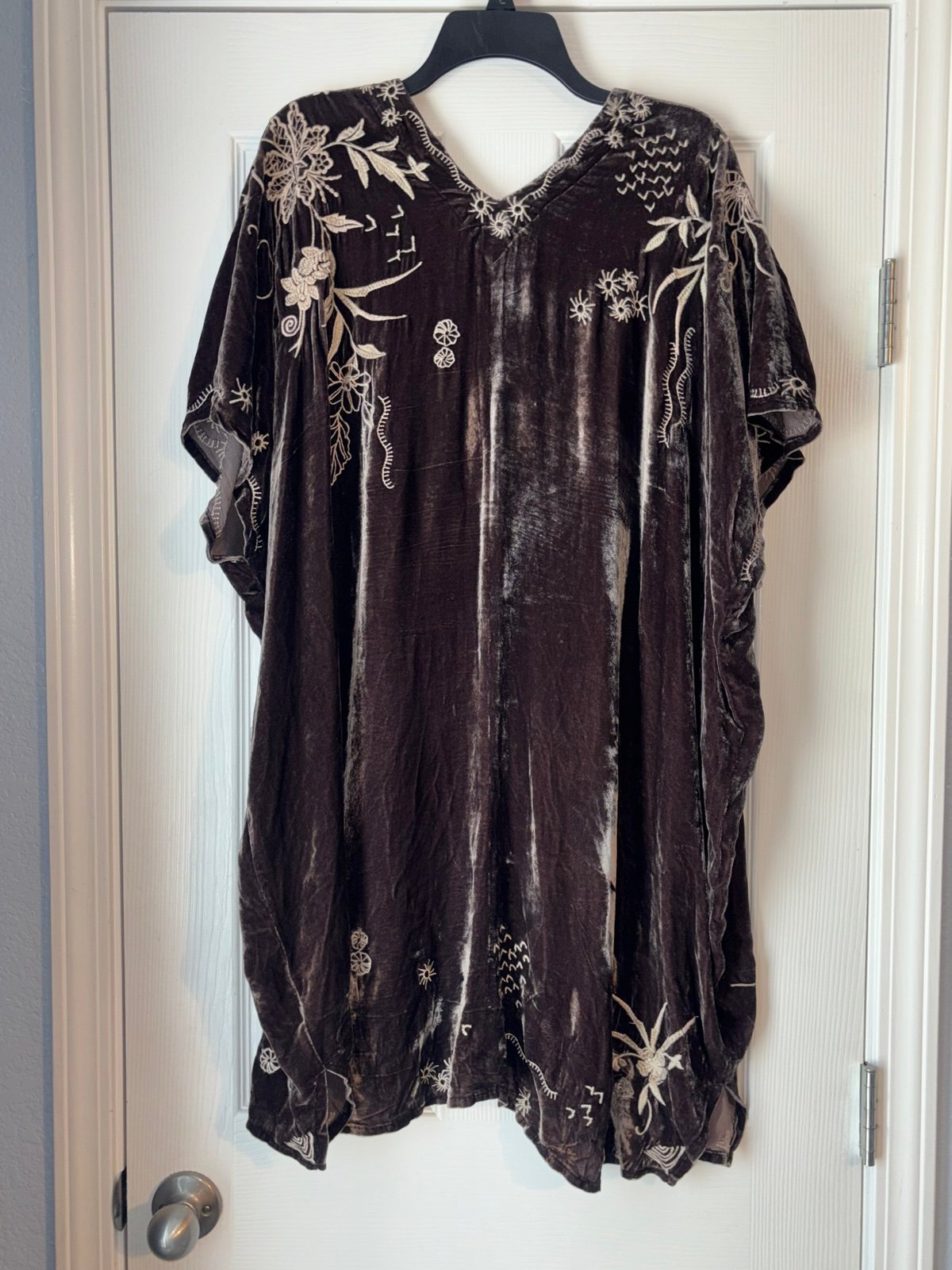 The Johnny Was Maree Velvet Kaftan in size XL is a stylish and comfortable piece perfect for a boho or hippie-inspired look. Made from a blend of silk, polyester, and rayon, this kaftan features a V-neckline, asymmetrical length, short sleeves, and intricate embroidered accents. The coffee bean taupe brown color and velvet fabric add a touch of luxury to the knee-length kaftan, making it a versatile and trendy addition to any woman's wardrobe.