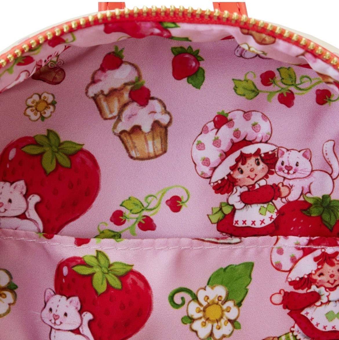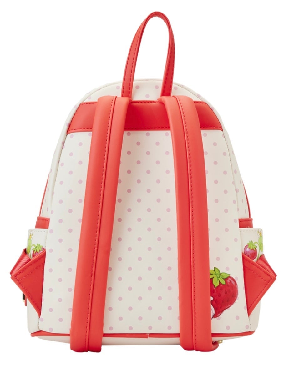 strawberry shaped front pocket, top part of door has opening hinge that reveals Strawberry Shortcake & Custard, A rubber strawberry charm, Above the pocket, is Strawberry Shortcake, Lemon Meringue, and Orange Blossom among the strawberry plants, and An AOP polka dots, backside features Strawberry Shortcake and Custard.