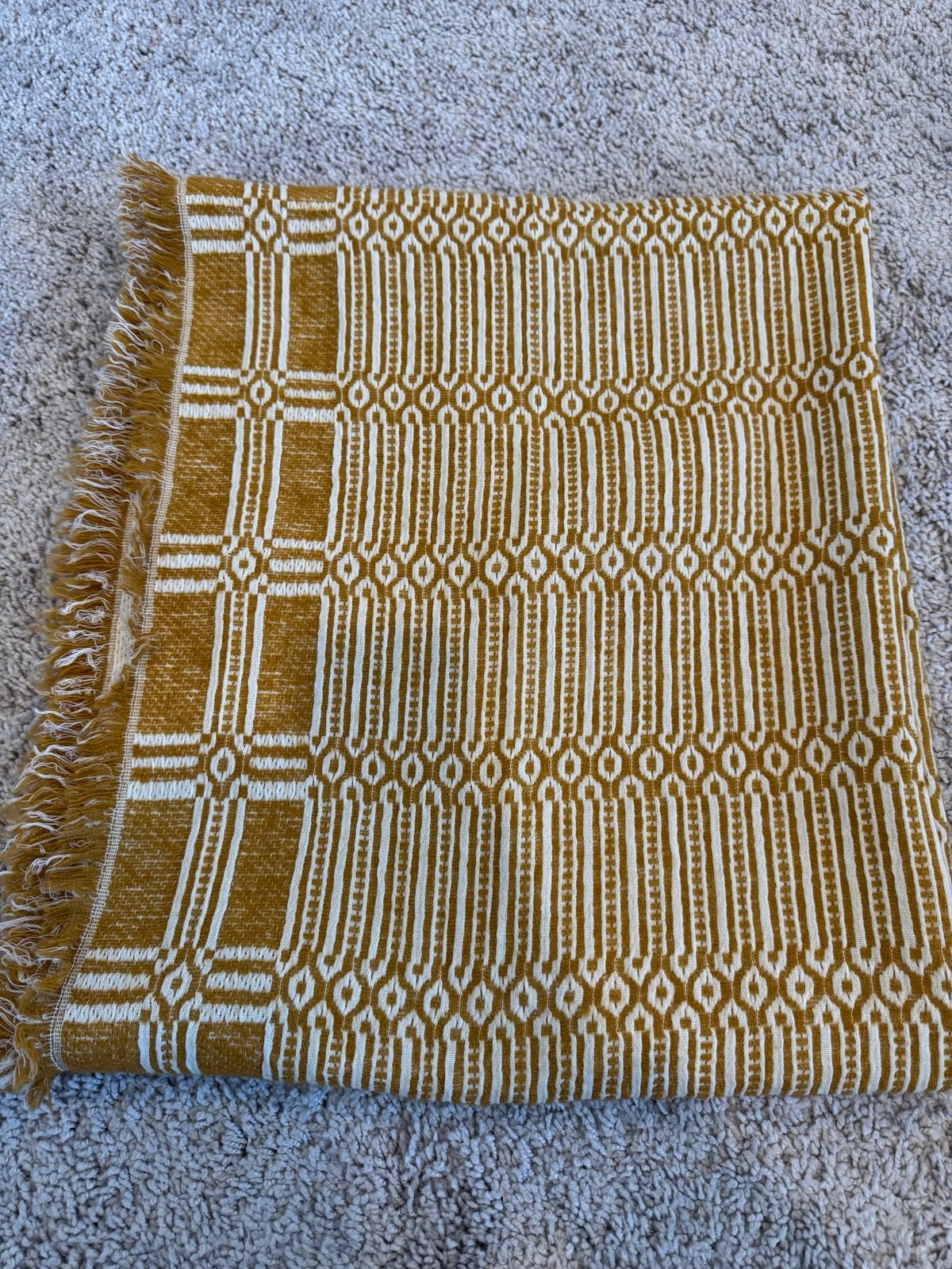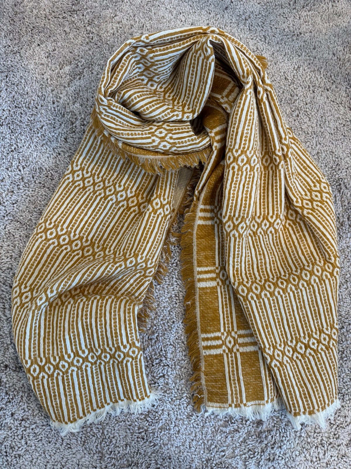 Madewell wool blend boho striped scarf wrap. Mustard yellow gold color with cream in geometric pattern. Fringed edges on all sides. Style G0293. 66% wool, 20% acrylic, 14% nylon. 80" long, 34" wide.