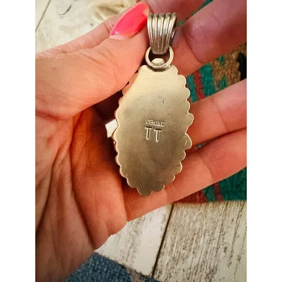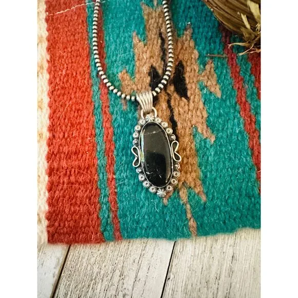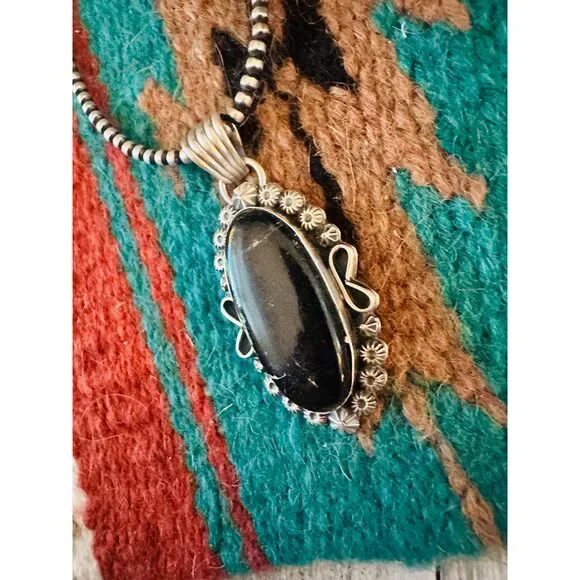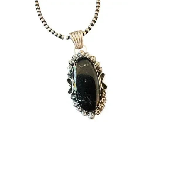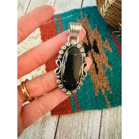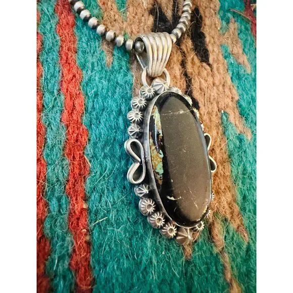 New without tags* BRAND : Handmade * ETHNIC REGIONAL STYLE : Native American * JEWELRY TYPE : Necklaces * TYPE : Pendant * COLOR : Black * TRIBAL AFFILIATION : Navajo * METAL : Sterling Silver * MAIN STONE : TurquoiseAwesome Navajo Sterling Silver and Black Jack Turquoise Pendant. Such a beautiful stone! Pendant measures 2 3/8 inches long and 1 inch wide. Bale is just over 1/4 of an inch across. Stamped Sterling and signed by the artist. Beads not included. Thank you for looking at our items. Please contact us if you have any questions. 3/31/25