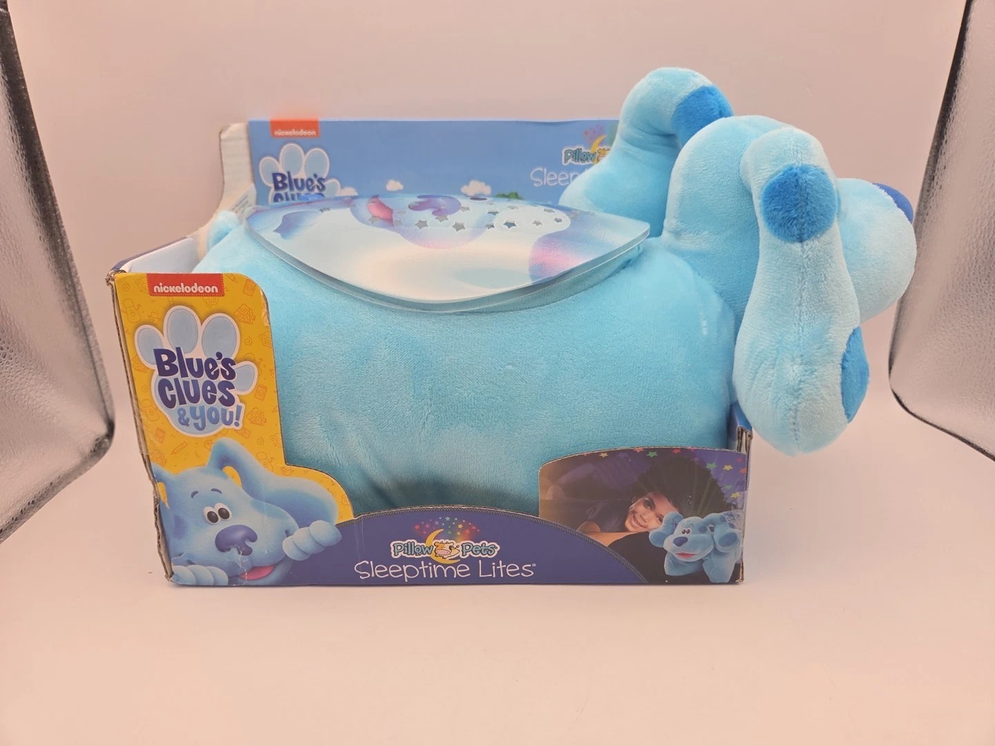The Pillow Pets Sleep Time Lites Blue's Clues Blue plush toy is a 11-inch night light stuffed animal featuring the beloved Blue character from the popular TV show. With its soft and cuddly design, this product offers both comfort and entertainment for children. The built-in night light adds an extra element of fun, making it a great companion for bedtime or as a cute addition to any room.